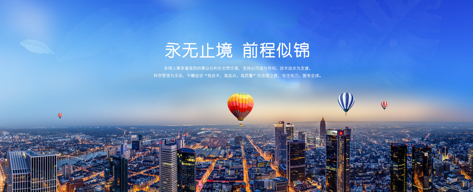 “永無(wú)止境、前程似錦”——永錦人秉承著強(qiáng)烈的事業(yè)心和社會(huì)責(zé)任感,堅(jiān)持以市場(chǎng)為導(dǎo)向、技術(shù)進(jìn)步為支撐、科學(xué)管理為手段,不懈追求“高技術(shù)、高起點(diǎn)、高質(zhì)量”的發(fā)展之路,專(zhuān)注電力、服務(wù)全球。