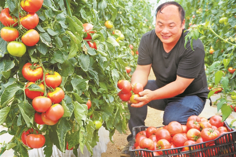 六盤(pán)水市返鄉(xiāng)青年李世瑤在蔬菜基地采摘西紅柿。
