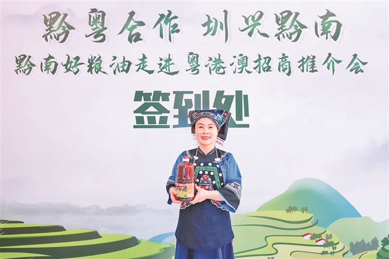 黔南州返鄉(xiāng)青年婁佳沁在粵港澳招商推介會(huì)上推介本地糧油。